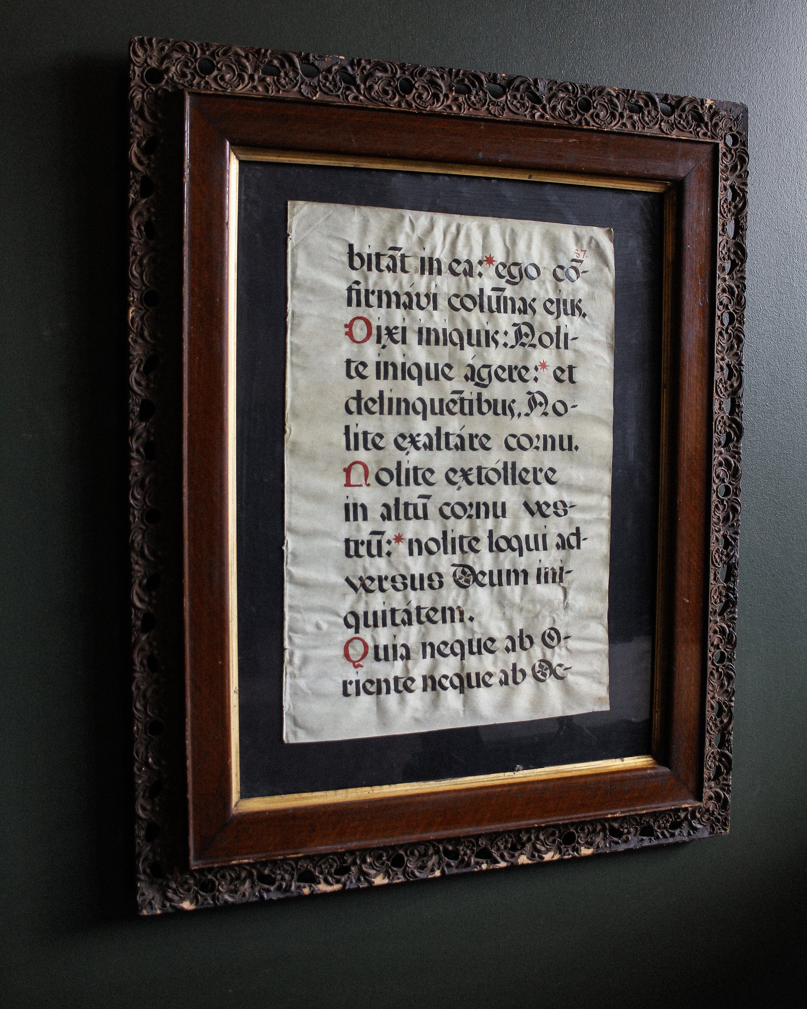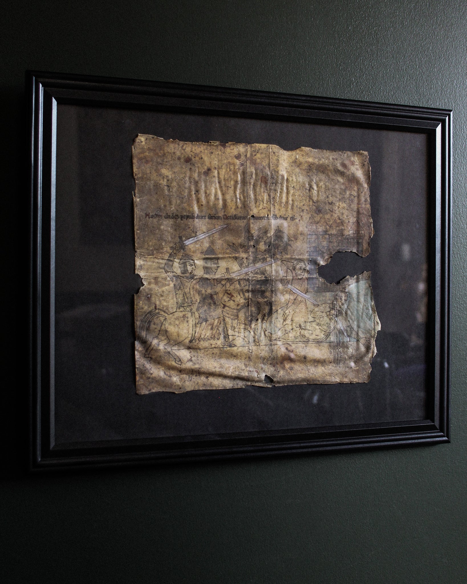 14th Century Vellum Fragment with Drawing of Knights Templar Fighting Demons in Frame