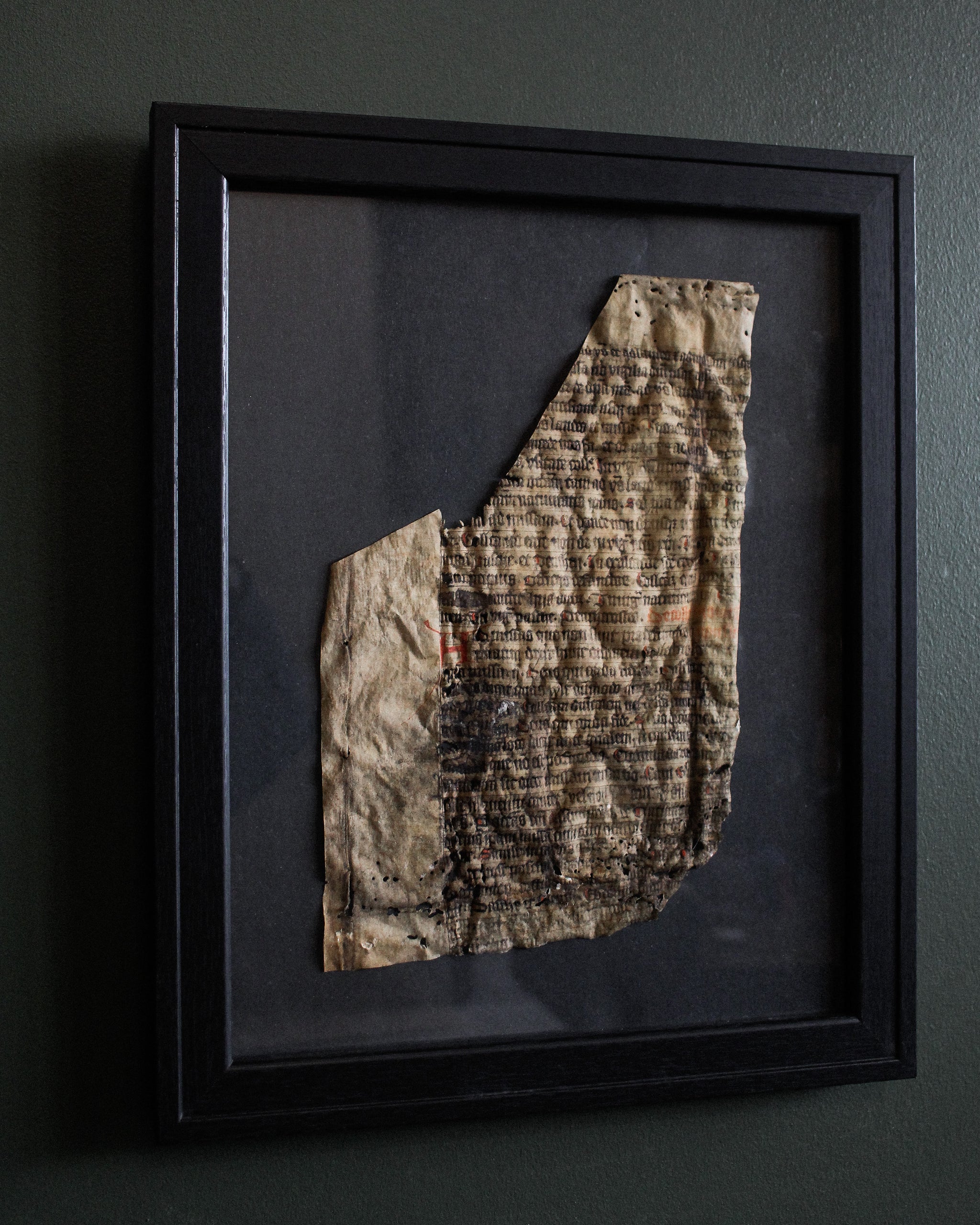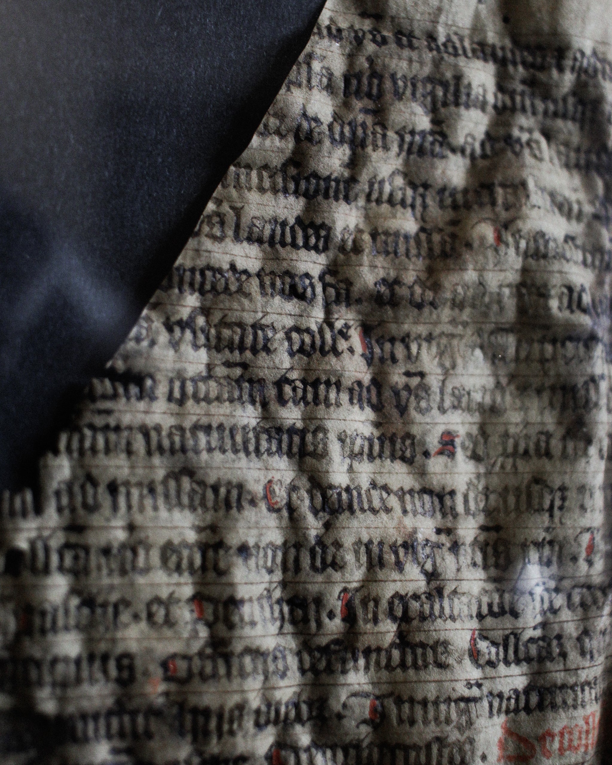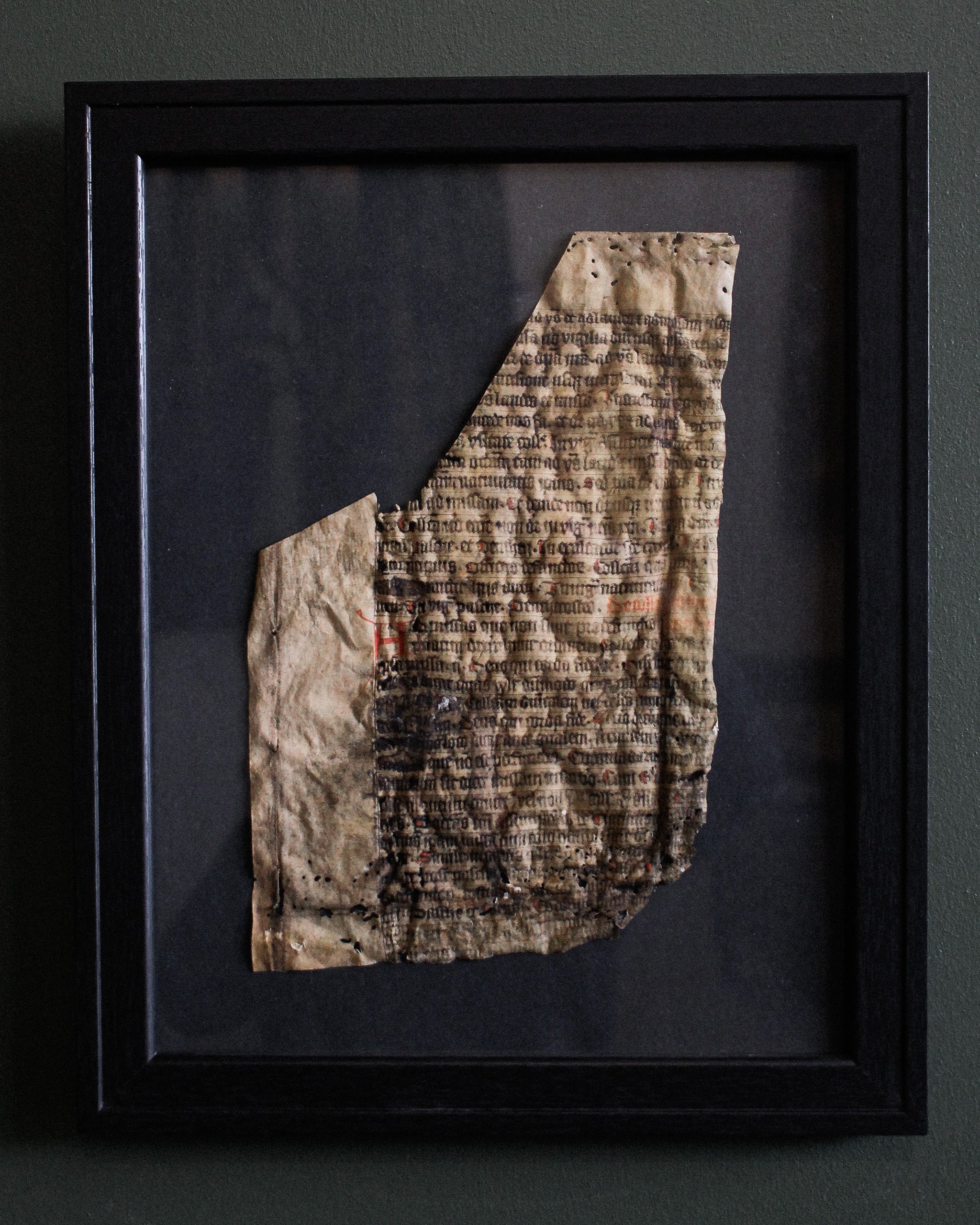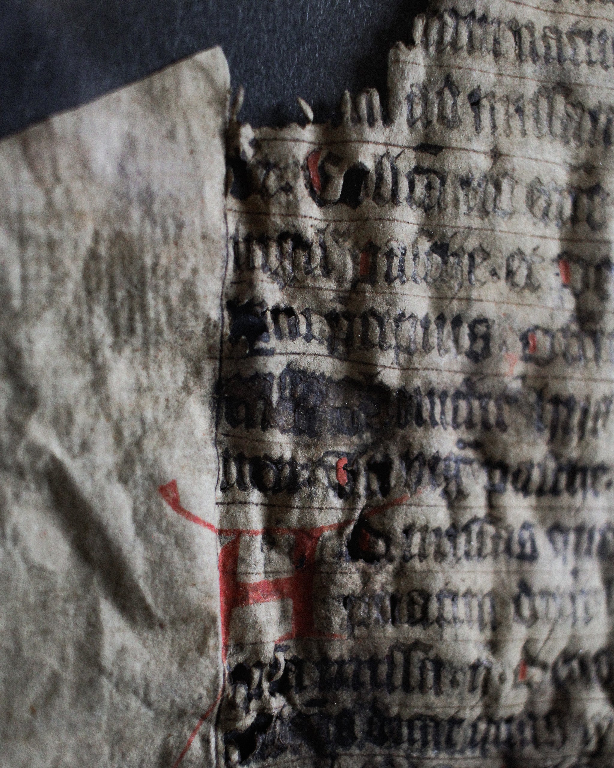 Beautiful 14th century fragmentary manuscript leaf from a missal or breviary, written in Latin with 34 lines of gothic script, as well as one red two line capital and red detailing throughout.