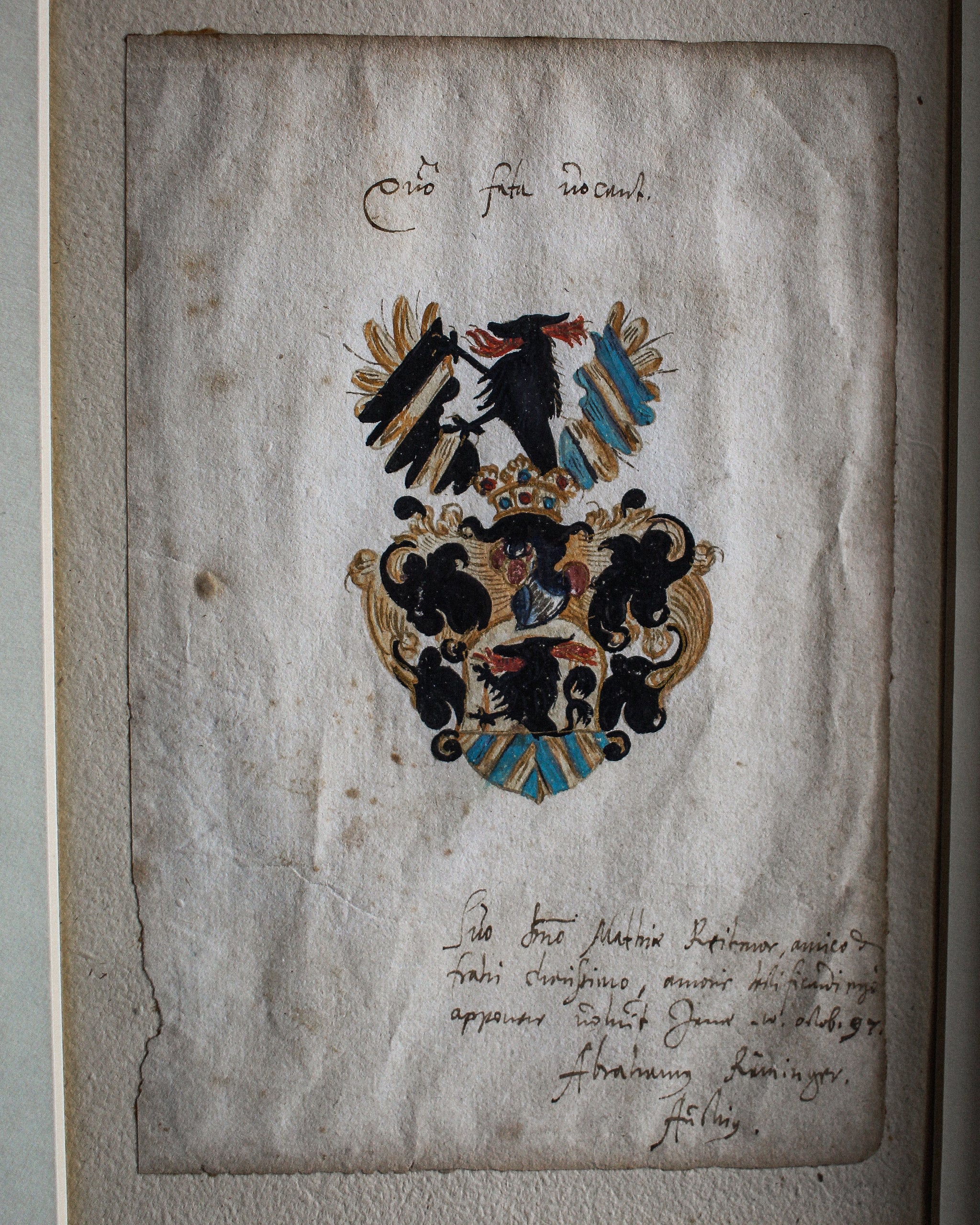 Stunningly painted heraldic crest, dating to the mid 16th century, Germany. With inscriptions above and below. Blues, blacks and yellows show beautifully while the red accent of fire comes through with such a force.