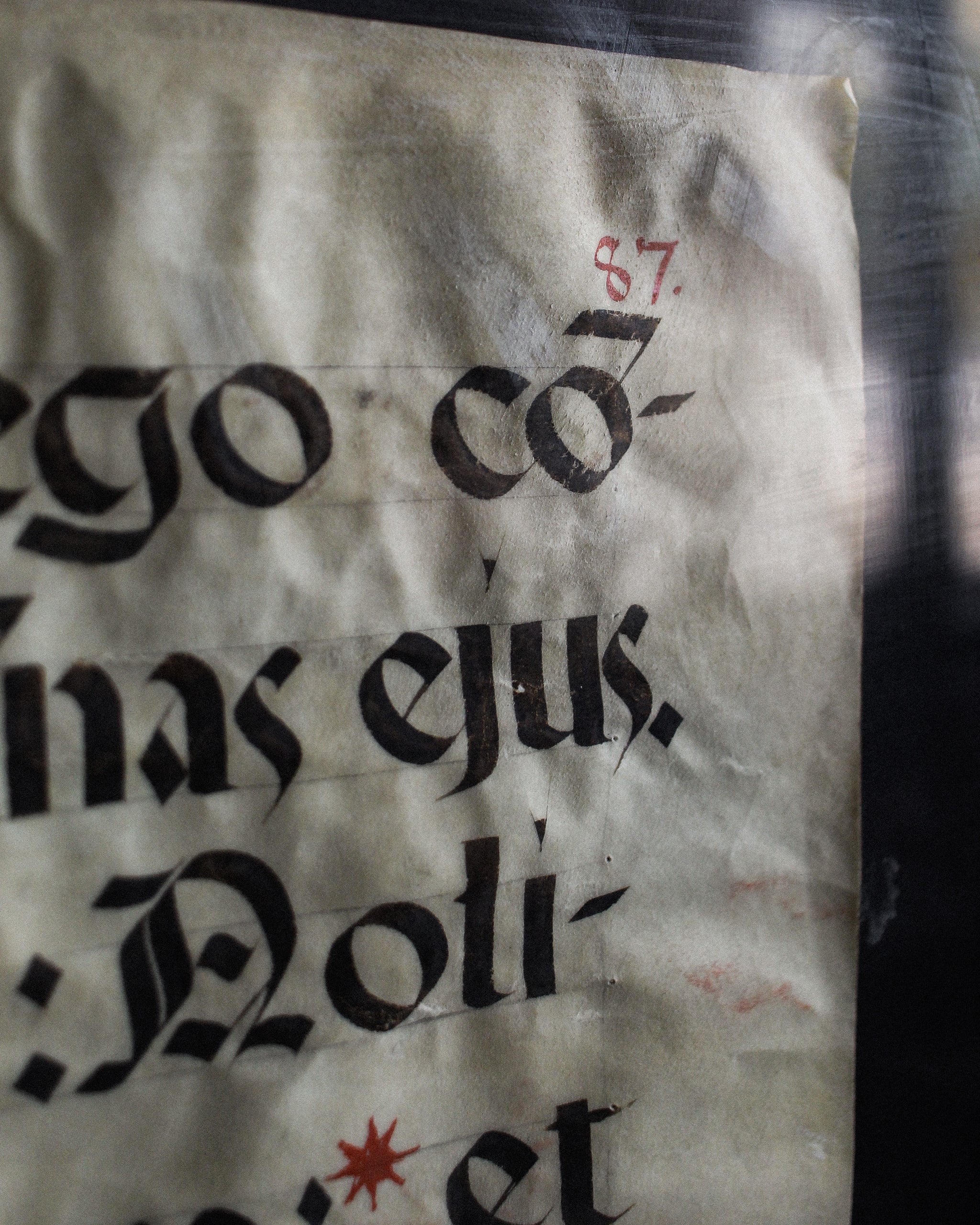 Beautiful 16th century vellum manuscript in a very large scale, done in black ink with red capital accents, with page number 87 in the top right. A stunningly well preserved example now housed in a later early 1900’s heavily carved frame.