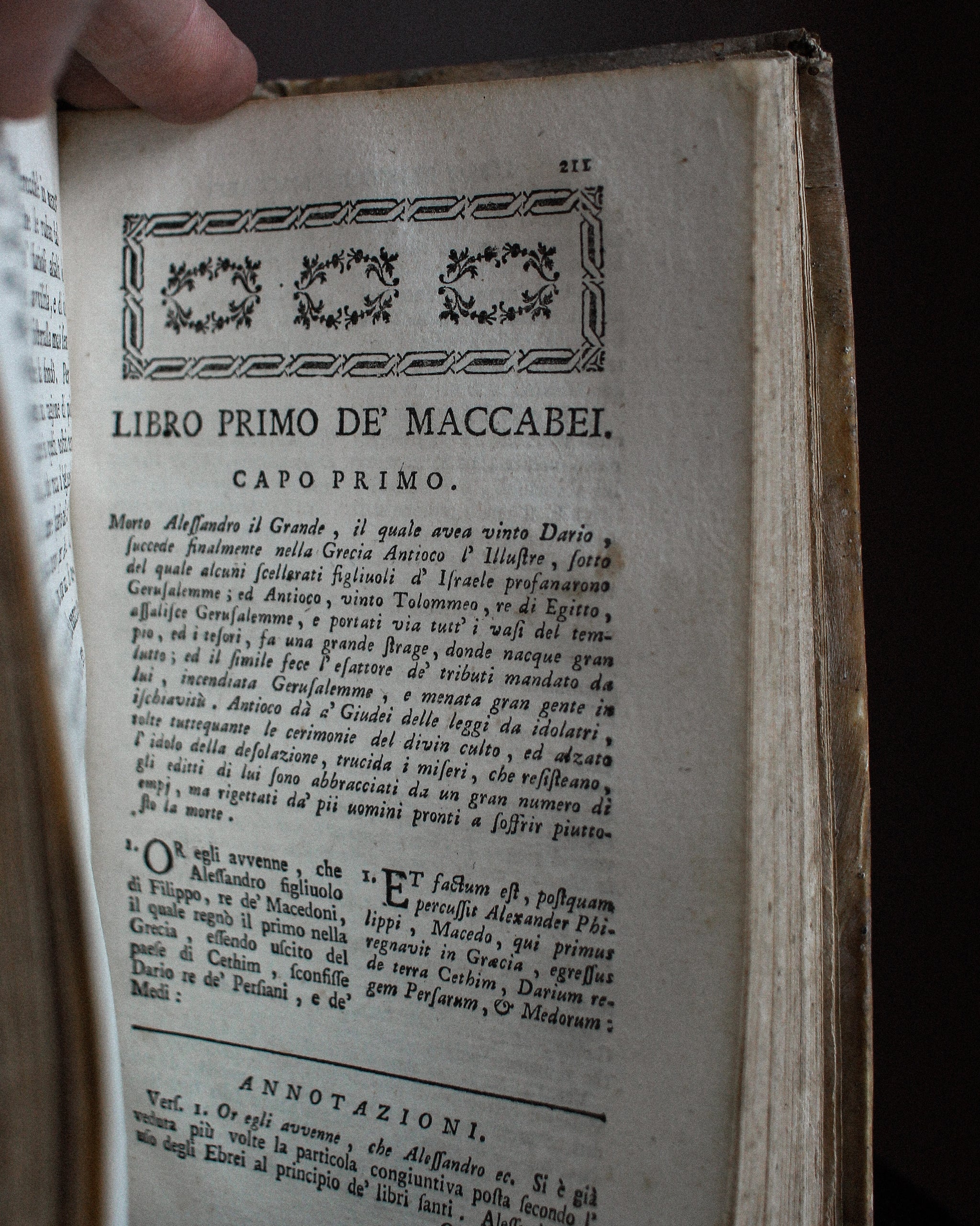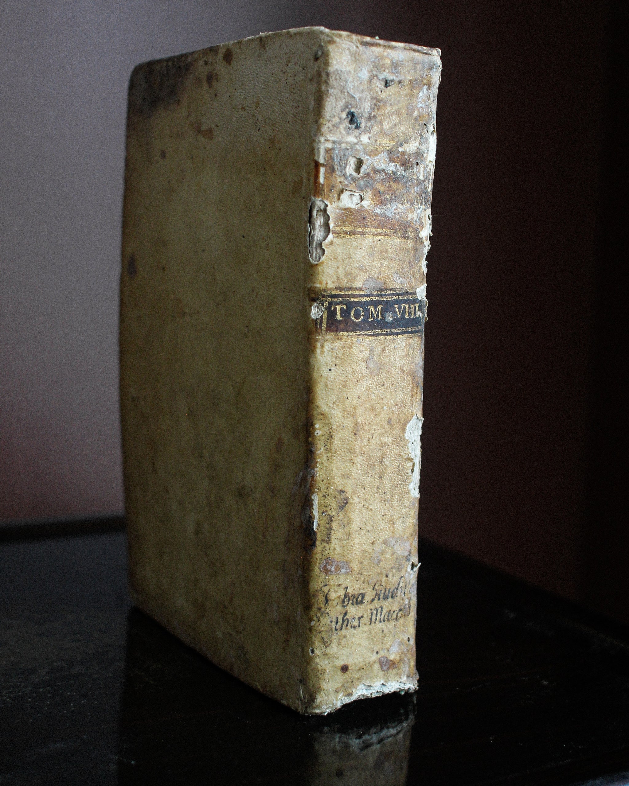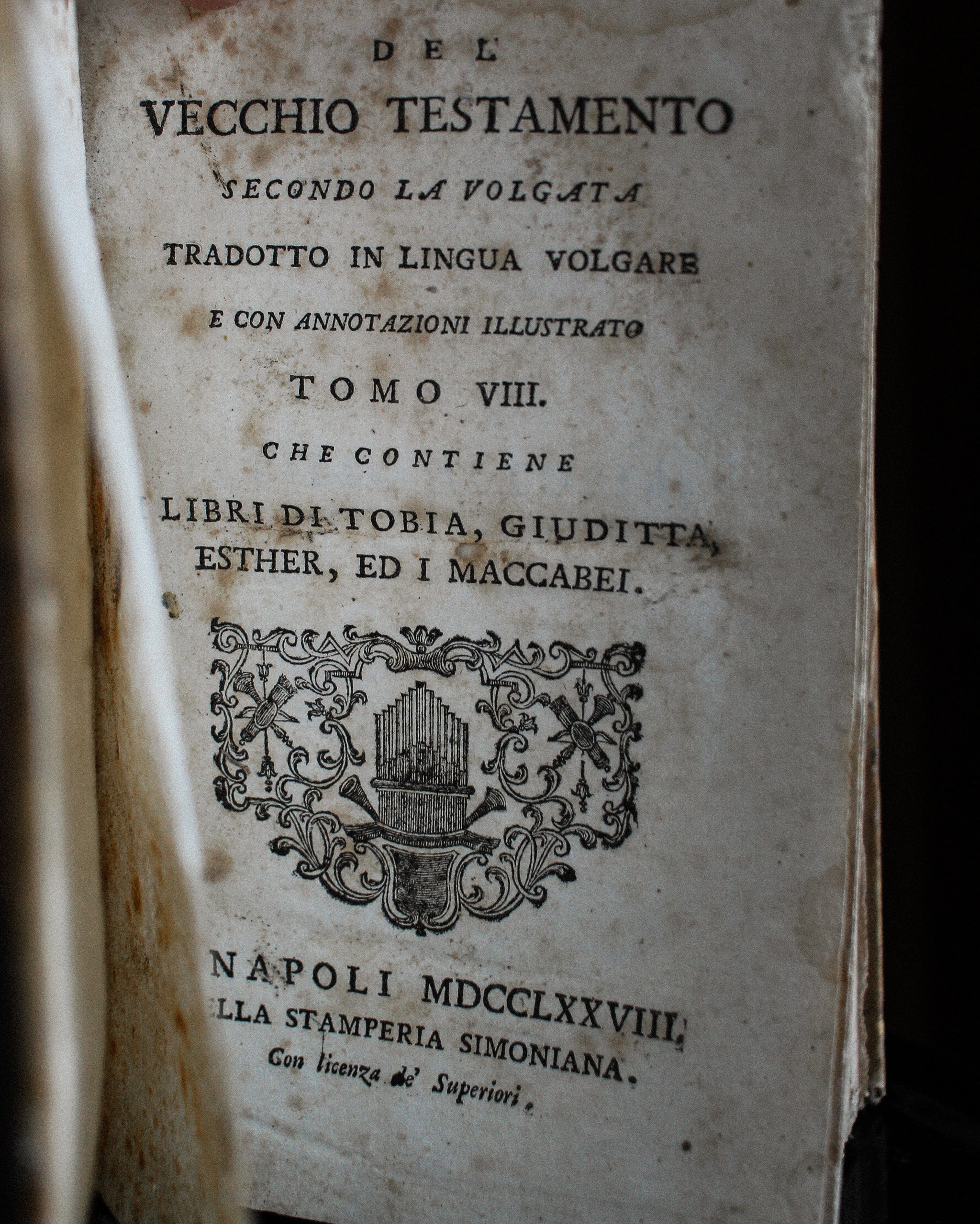 Printed in 1778, this copy of the Old Testament in Italian with accompanied Latin is bound in beautiful vellum with ink writing and embossed spine. Stunning aesthetic and character. Volume 8 of 17.