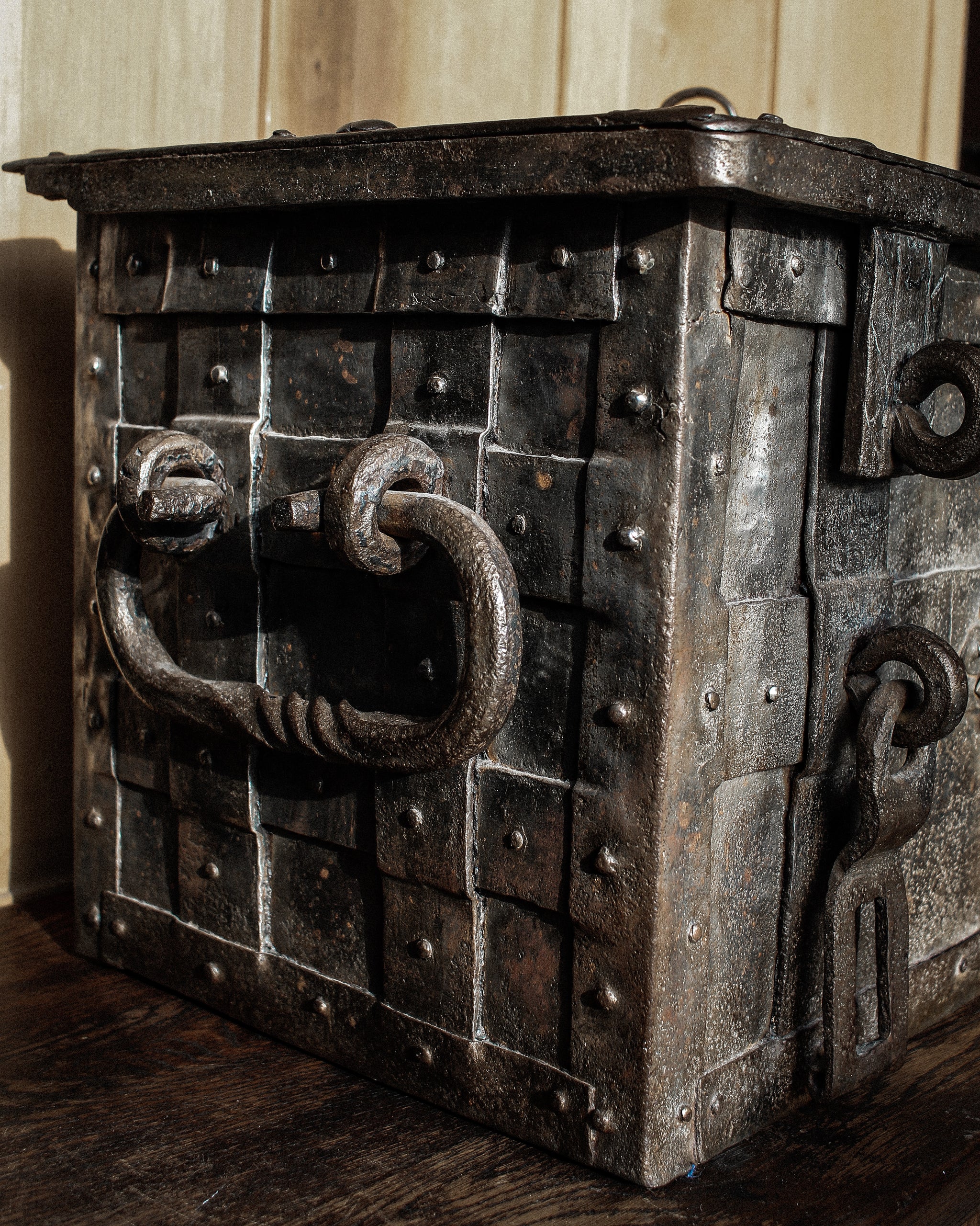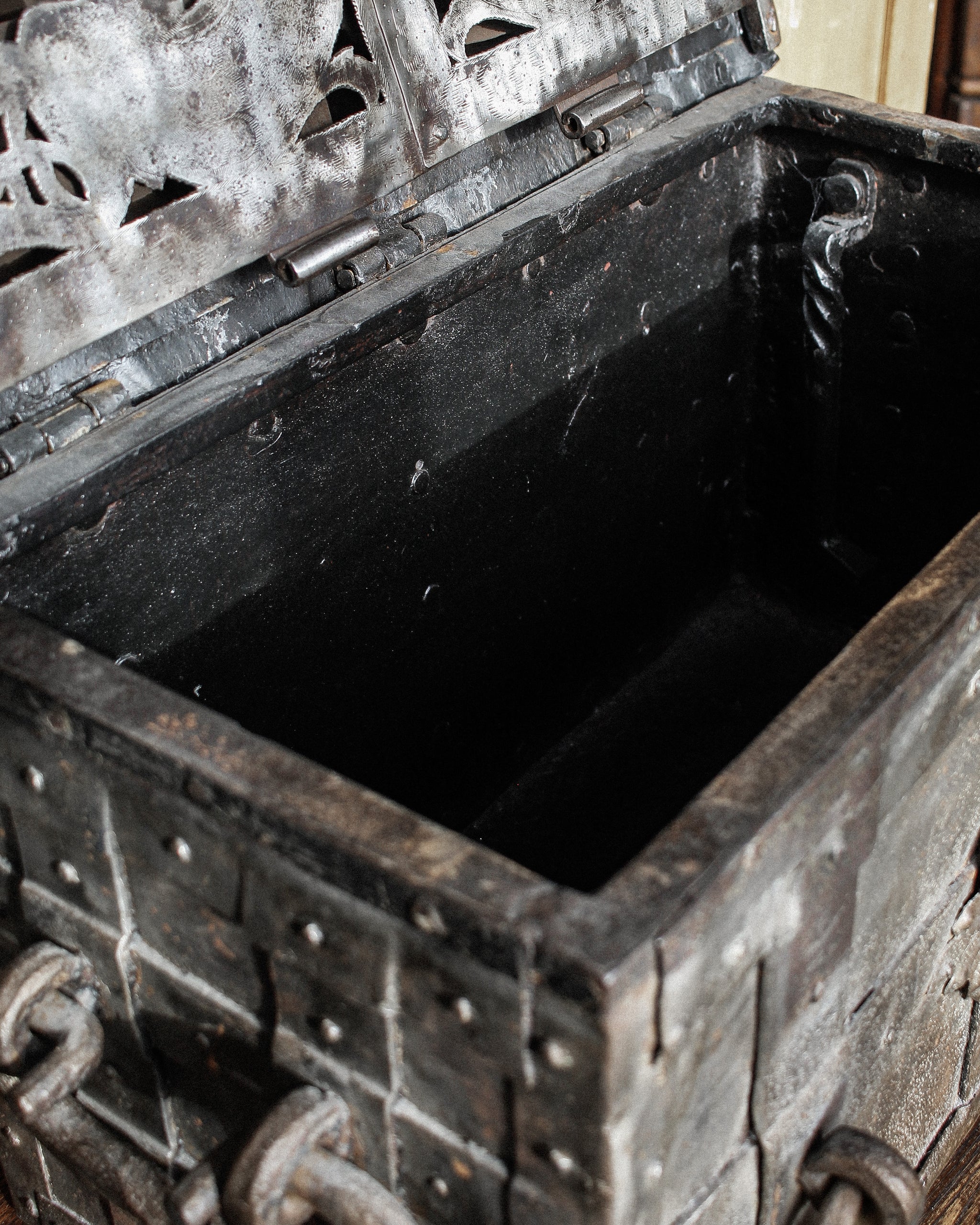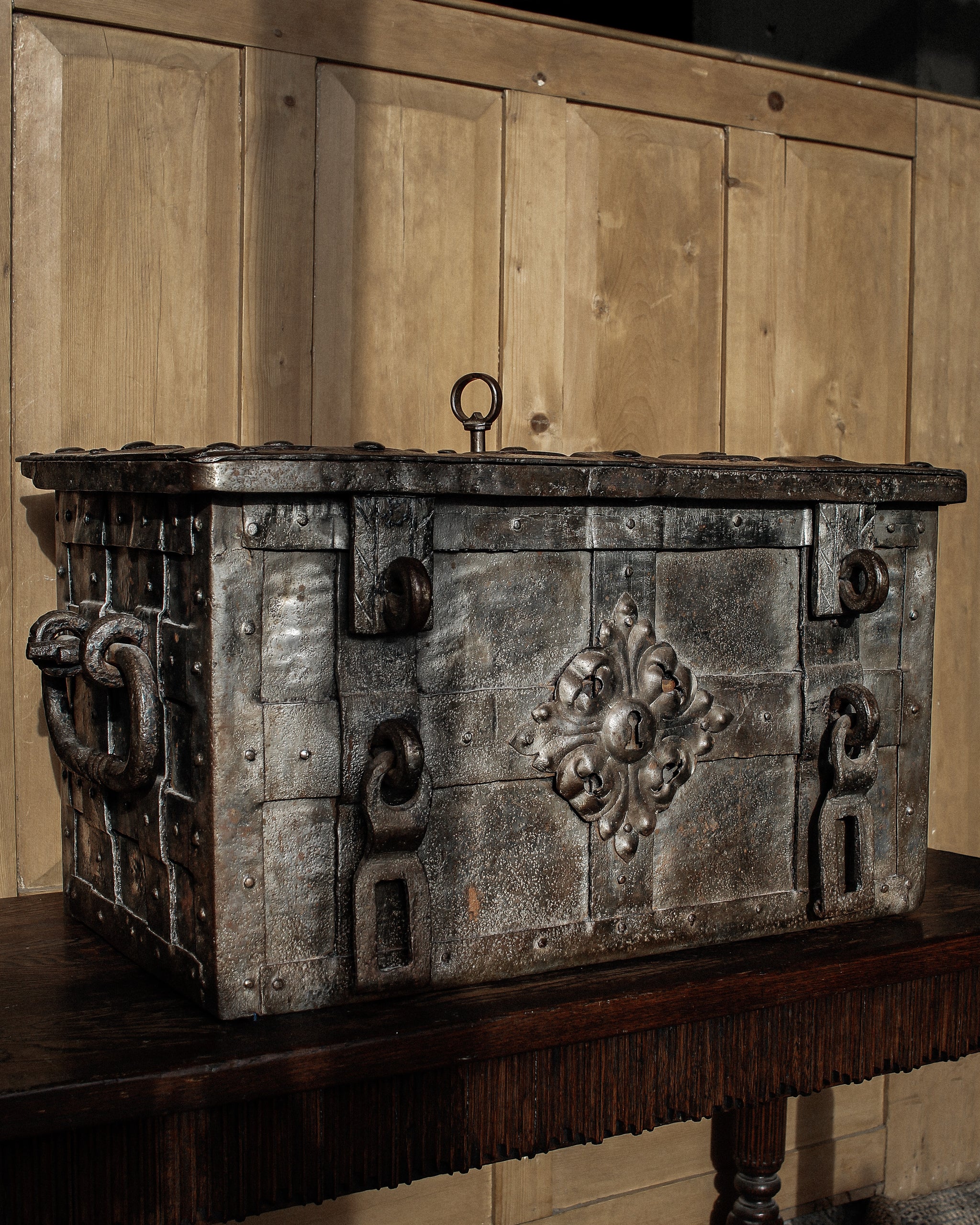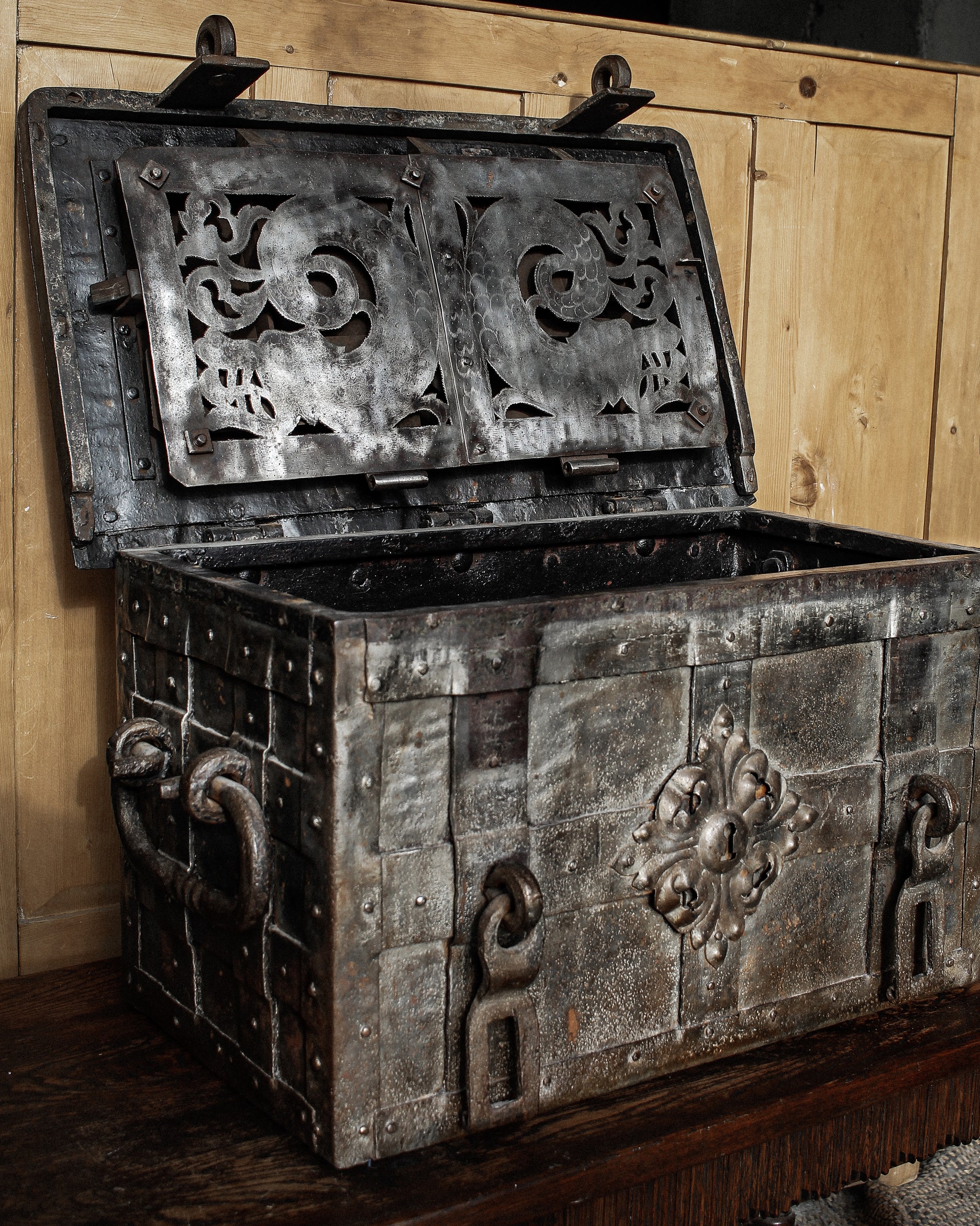 Absolutely incredible and very scarce early 17th century iron strongbox or “armada chest”, originating from Nuremberg, Germany. Originally built as a box to store valuables, money, an early safe - this chest, fully built of heavy iron, strapped, with a false front floral designed escutcheon, hidden top keyhole, built with utility and safety in mind exists as much on that plane as it does a beautiful piece of historic significance. Magnificent locking mechanism under the lid, hidden behind the most beautiful cut and designed and etched iron plate. One of the most beautiful and incredibly built pieces we have ever had the pleasure of bringing into the gallery.
