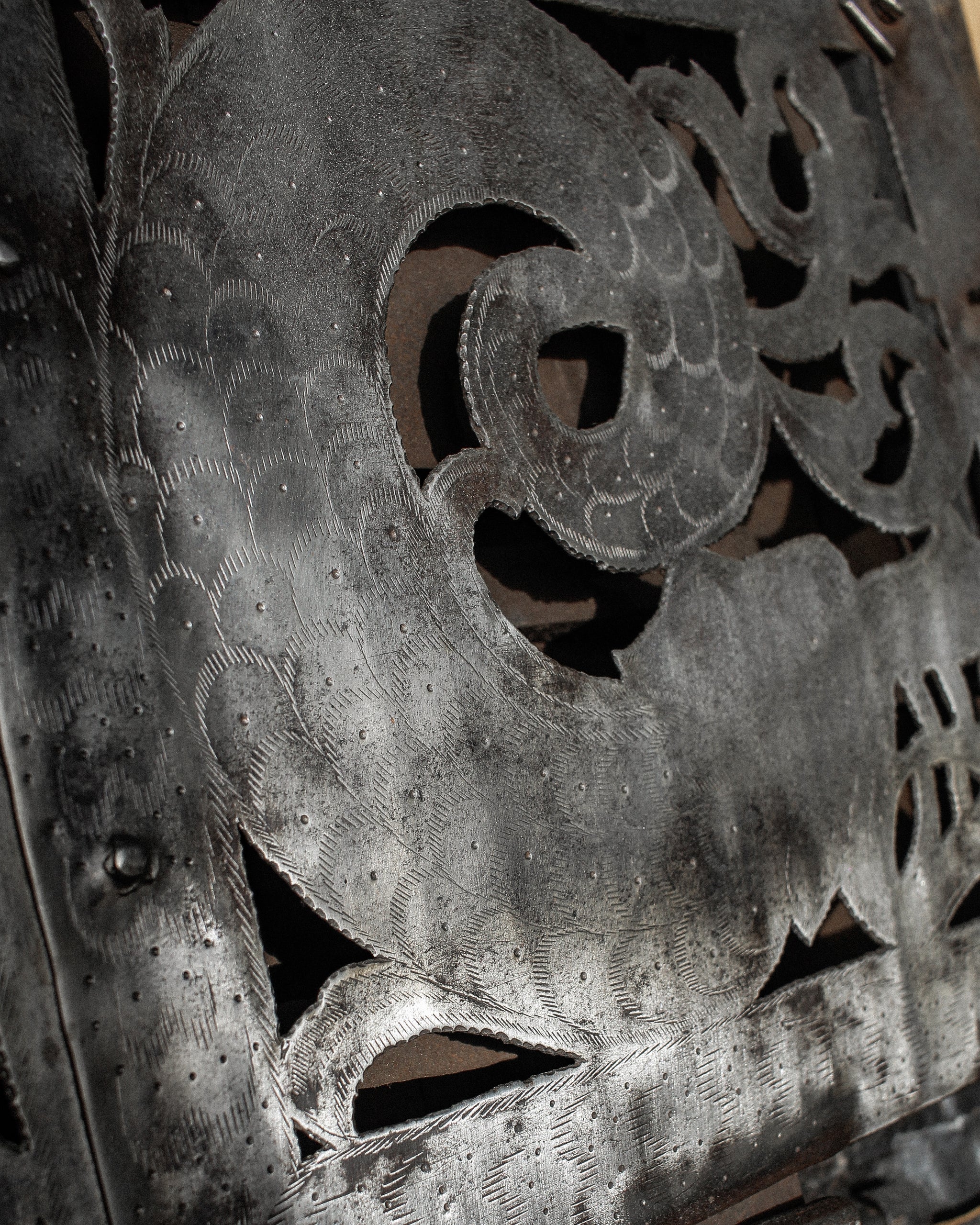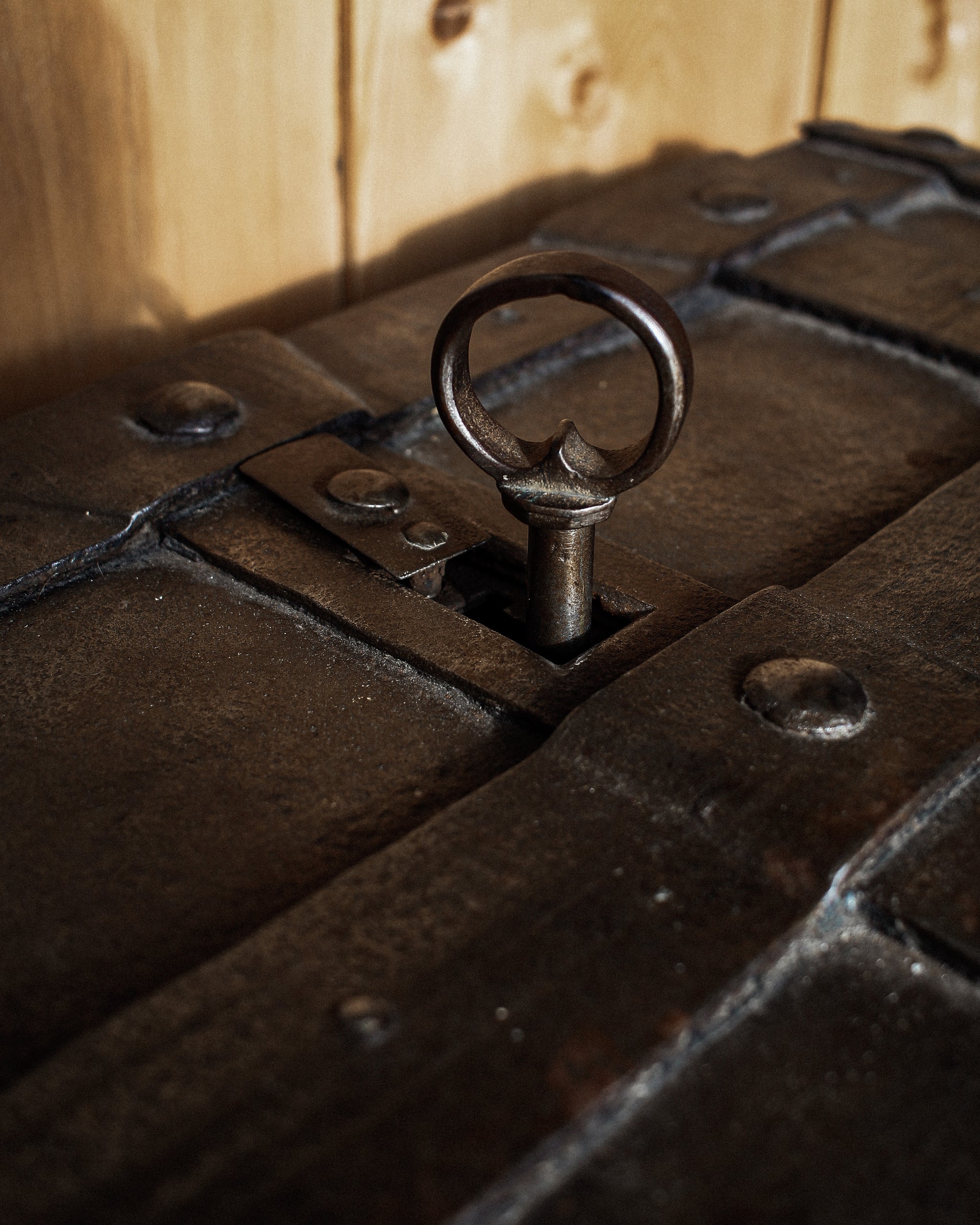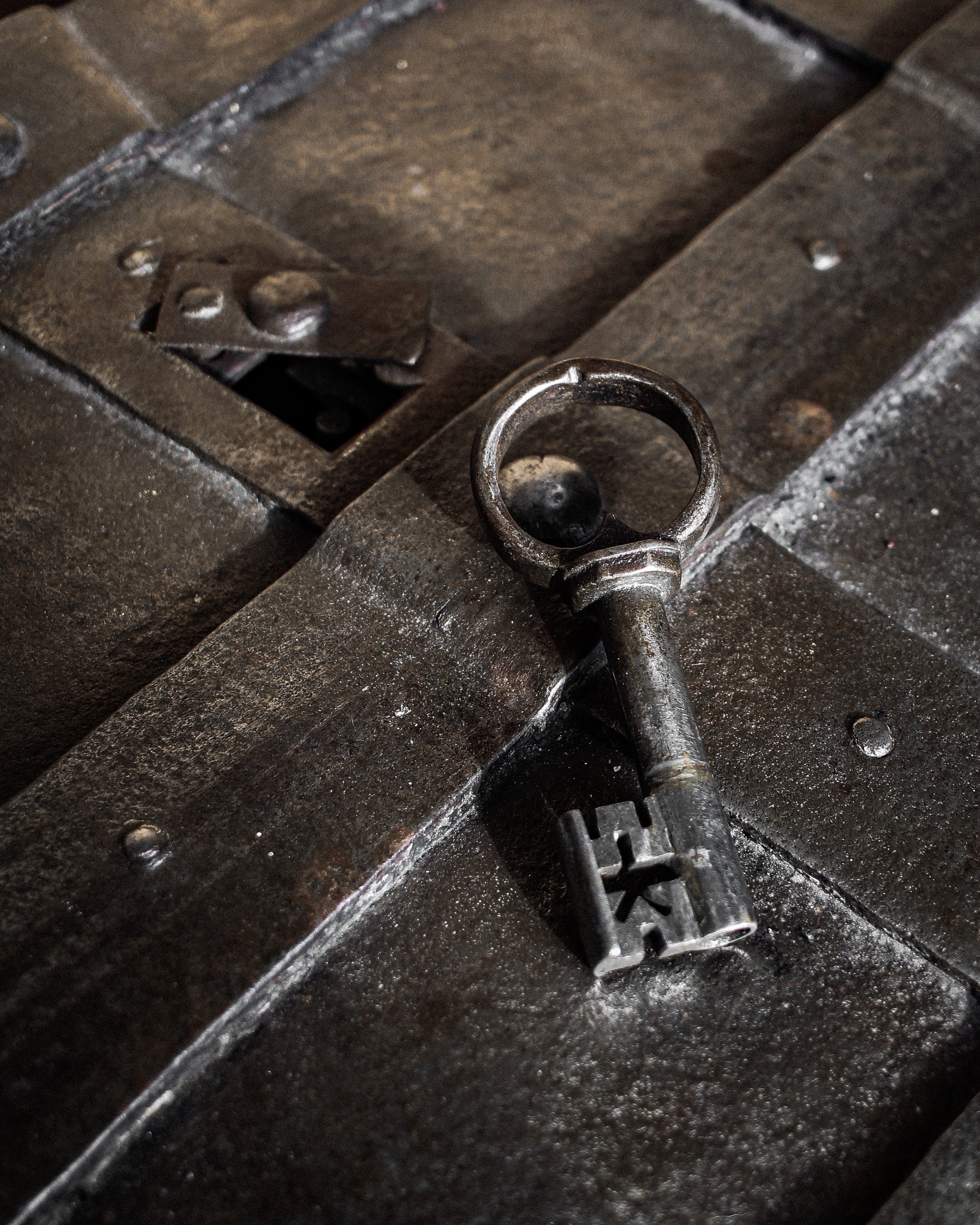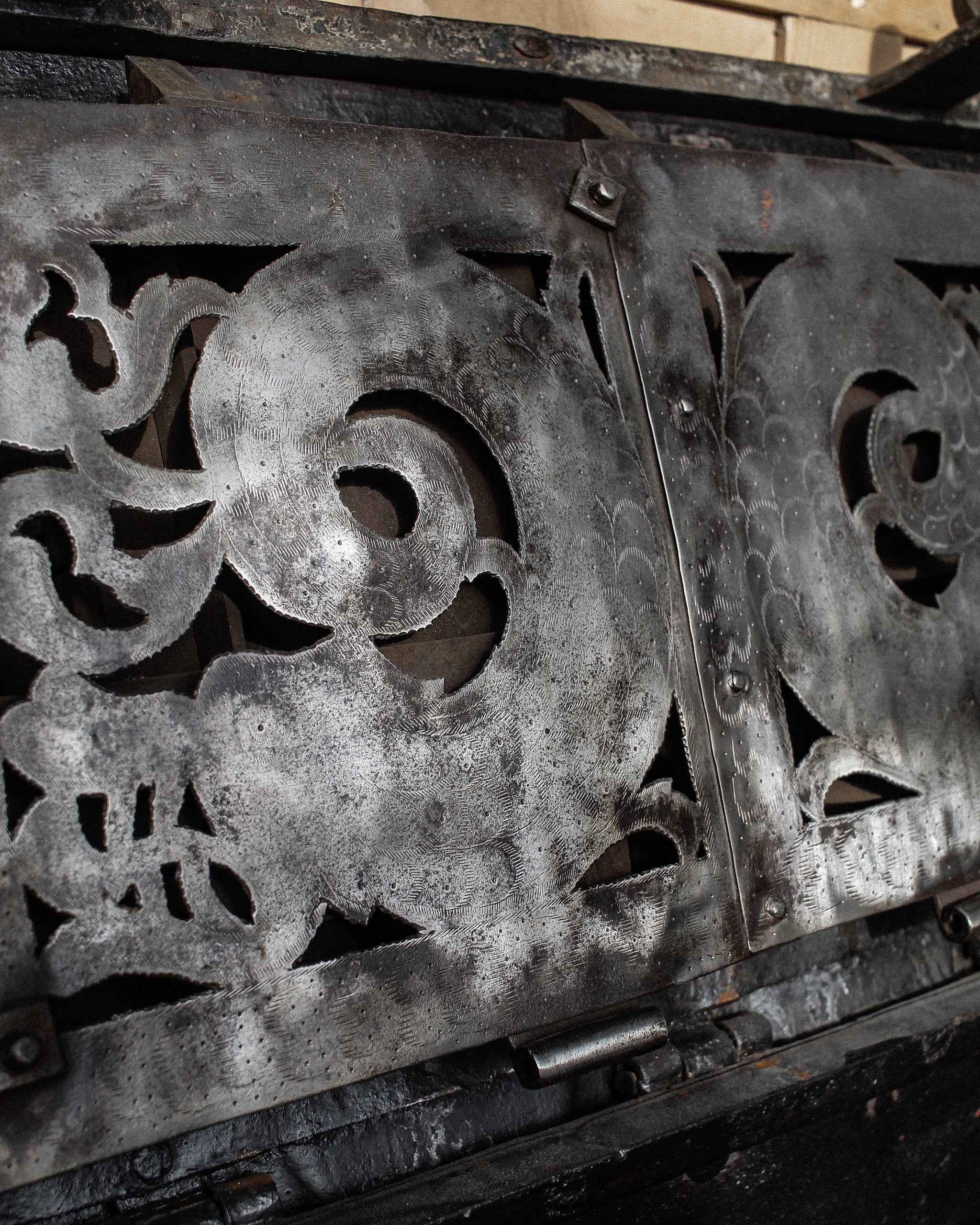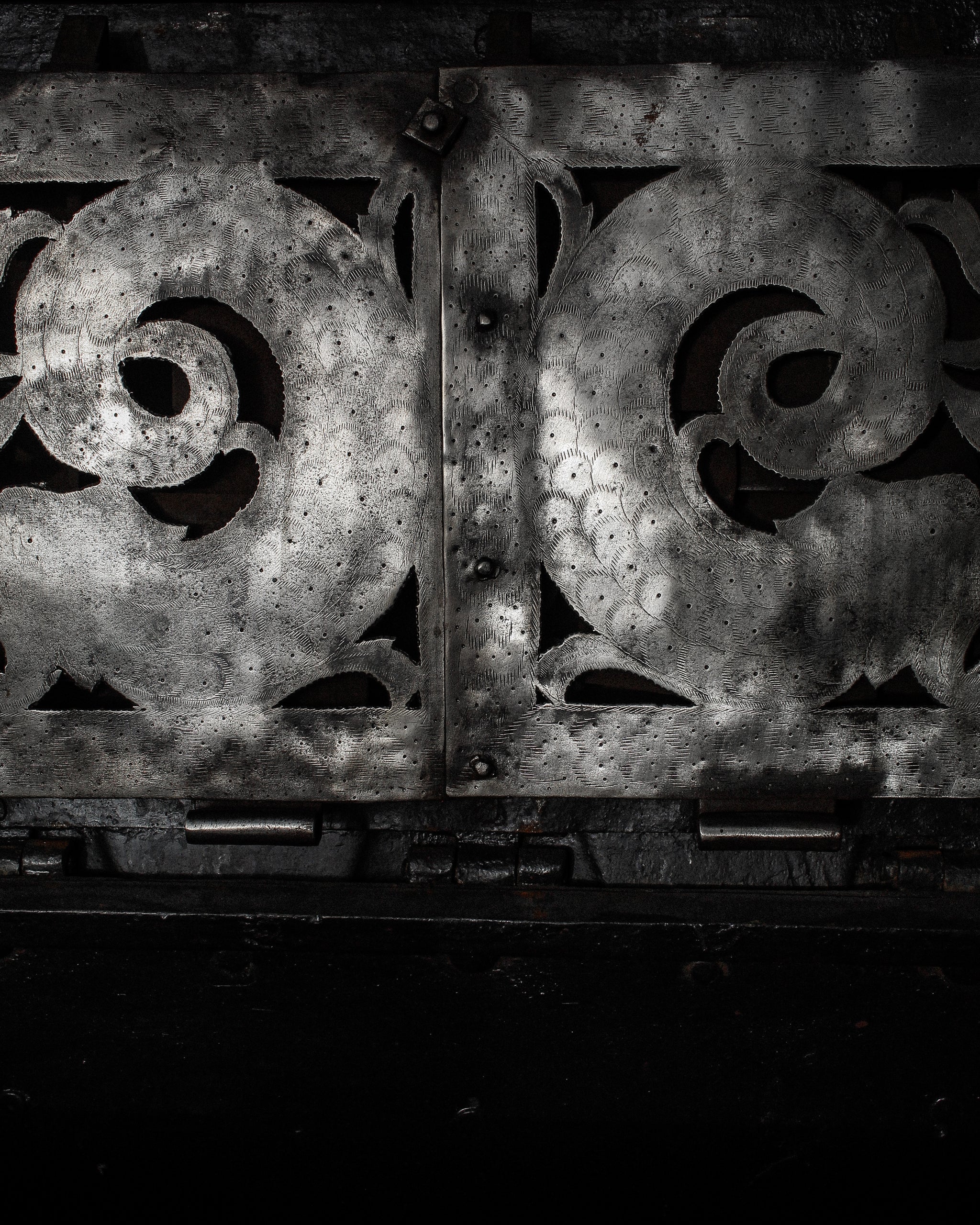 Absolutely incredible and very scarce early 17th century iron strongbox or “armada chest”, originating from Nuremberg, Germany. Originally built as a box to store valuables, money, an early safe - this chest, fully built of heavy iron, strapped, with a false front floral designed escutcheon, hidden top keyhole, built with utility and safety in mind exists as much on that plane as it does a beautiful piece of historic significance. Magnificent locking mechanism under the lid, hidden behind the most beautiful cut and designed and etched iron plate. One of the most beautiful and incredibly built pieces we have ever had the pleasure of bringing into the gallery.