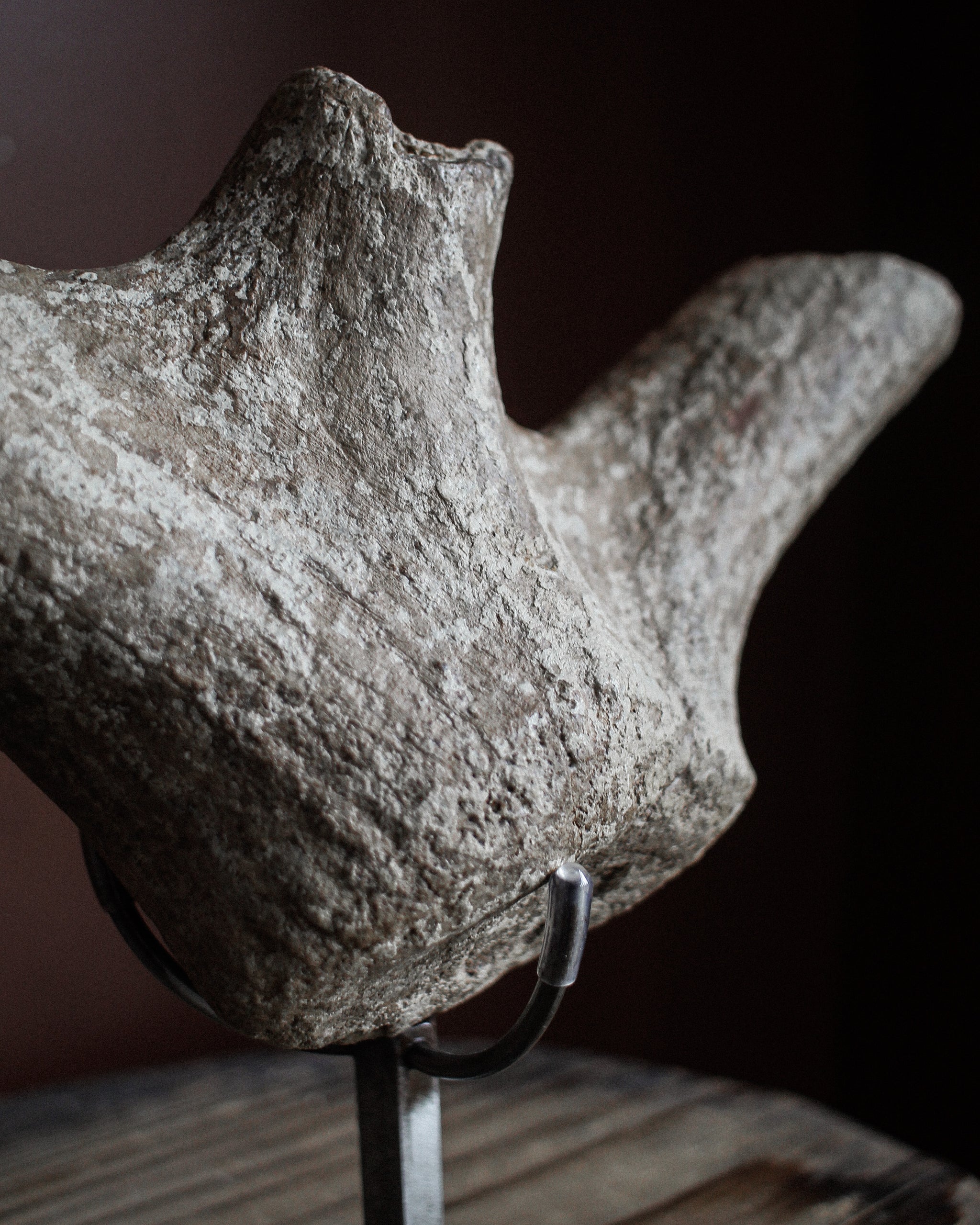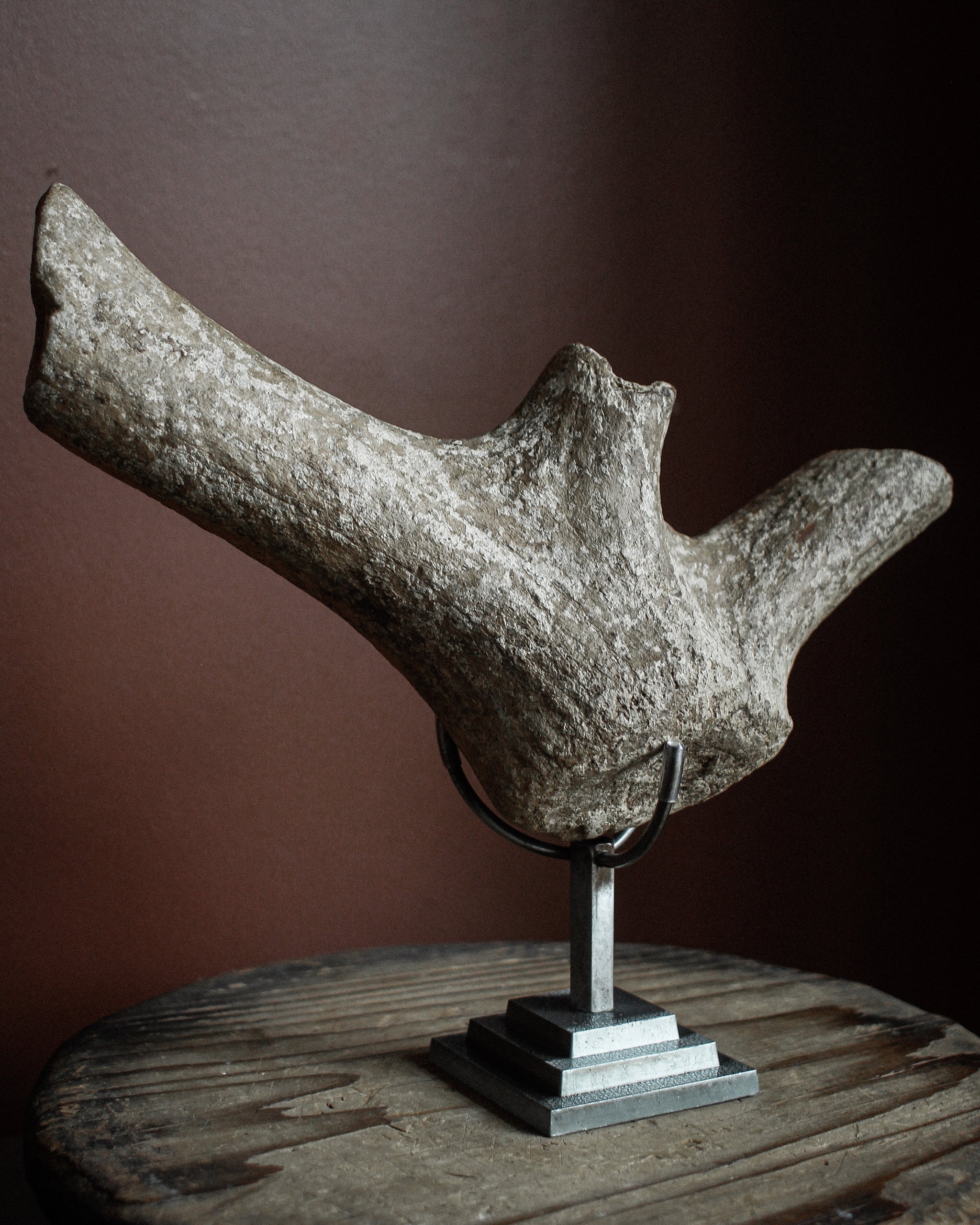 stunning fossilized bone of an ice age era Elk, late Pleistocene period, 20,000 years ago. Found in the Kansas River, United States. Displayed on contemporary stand.