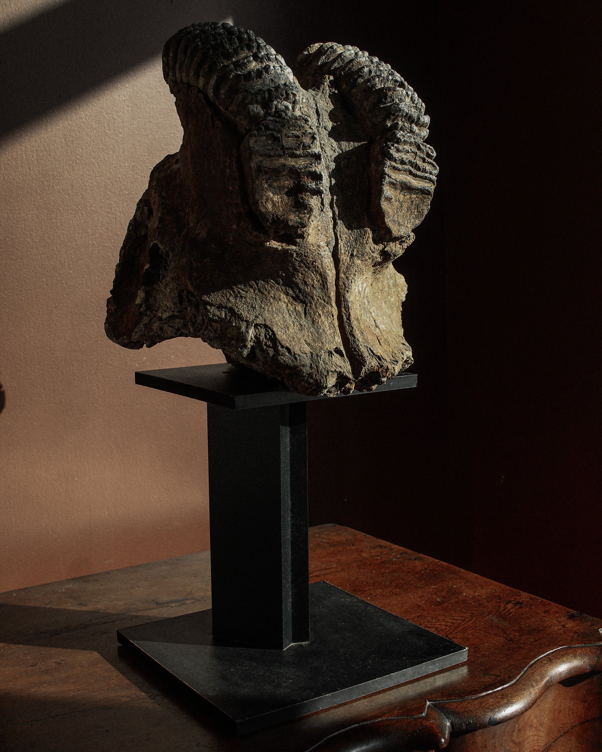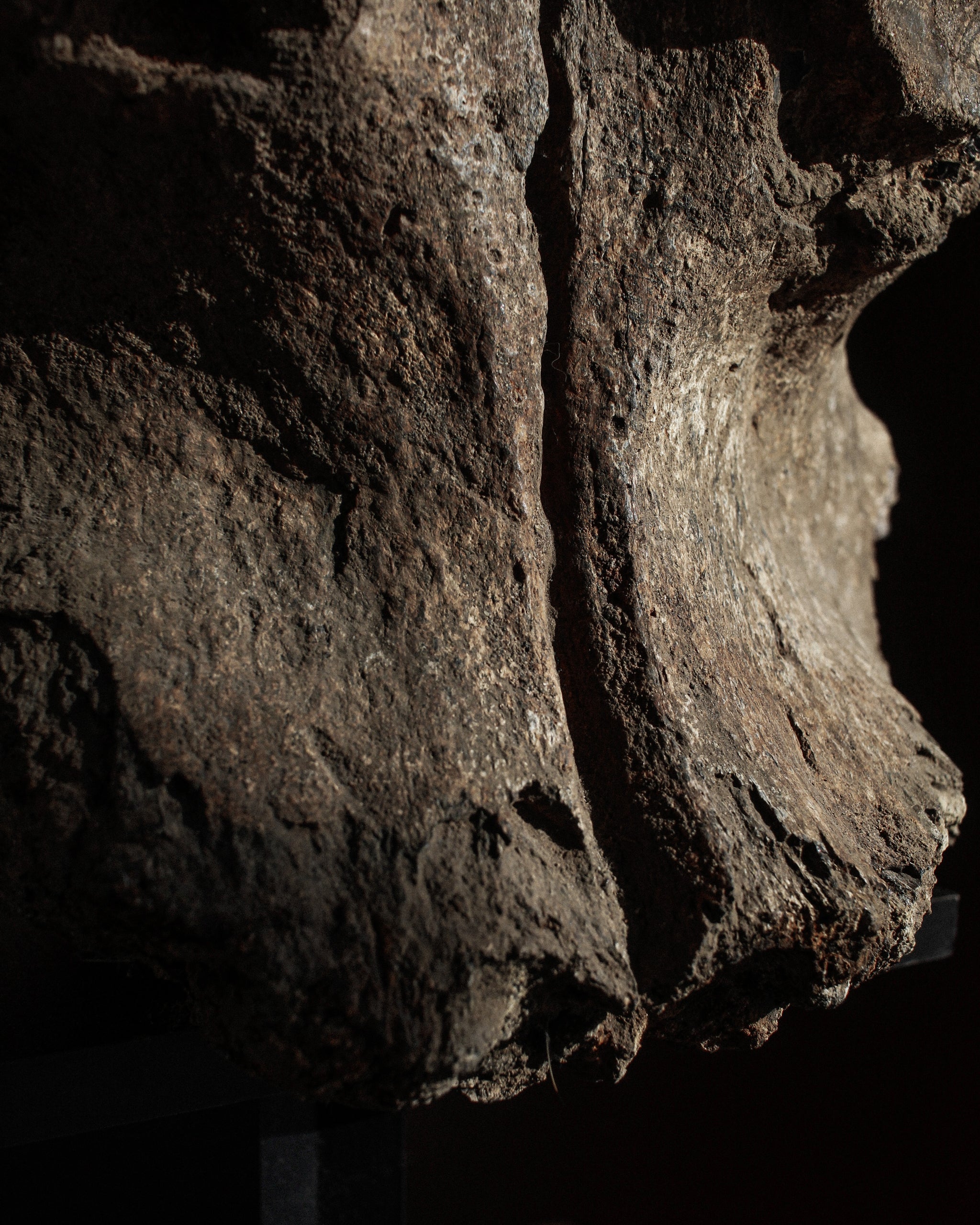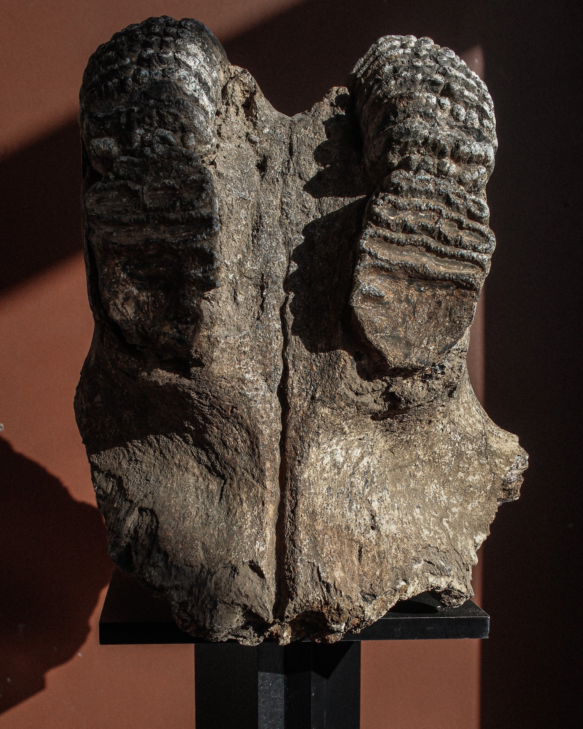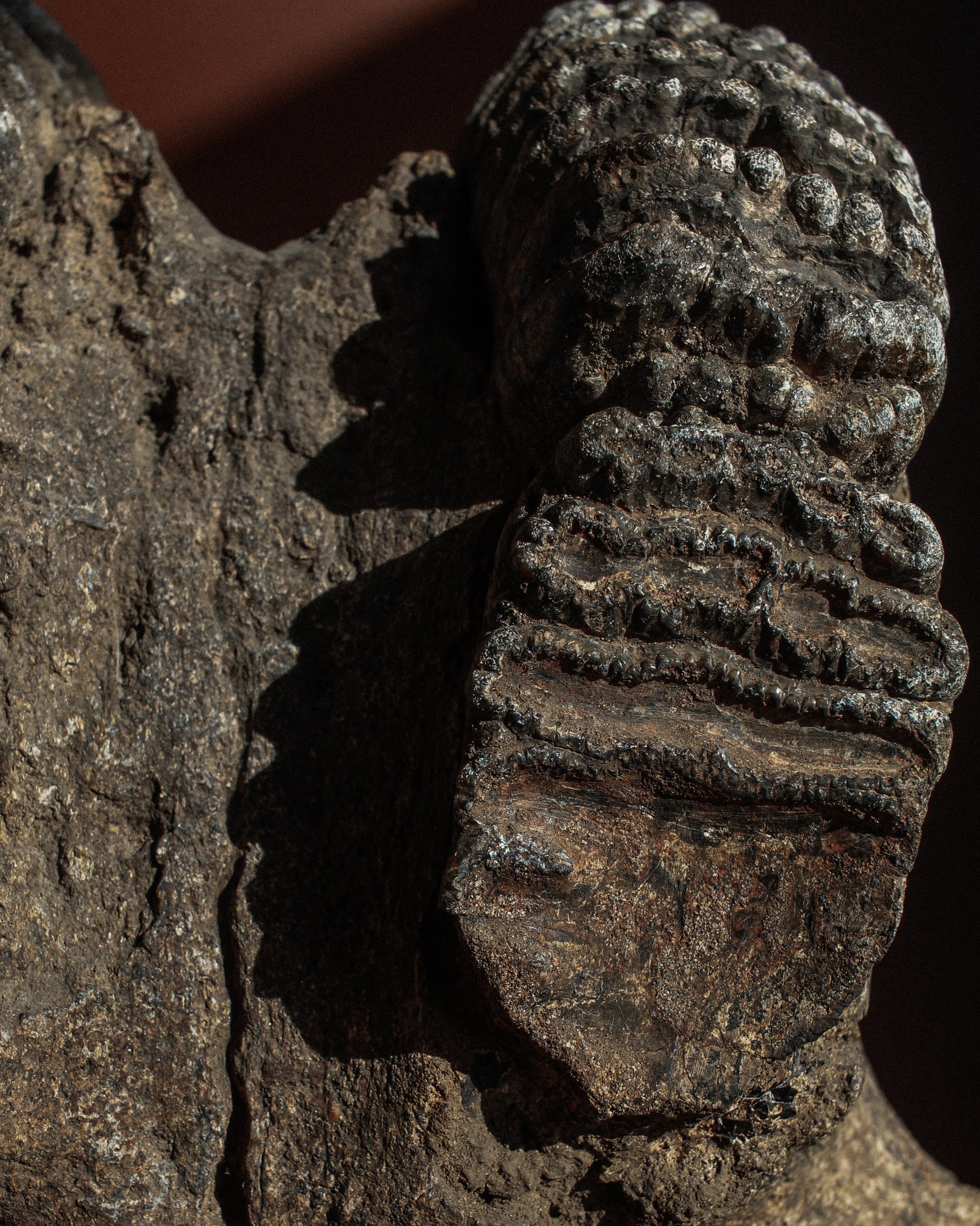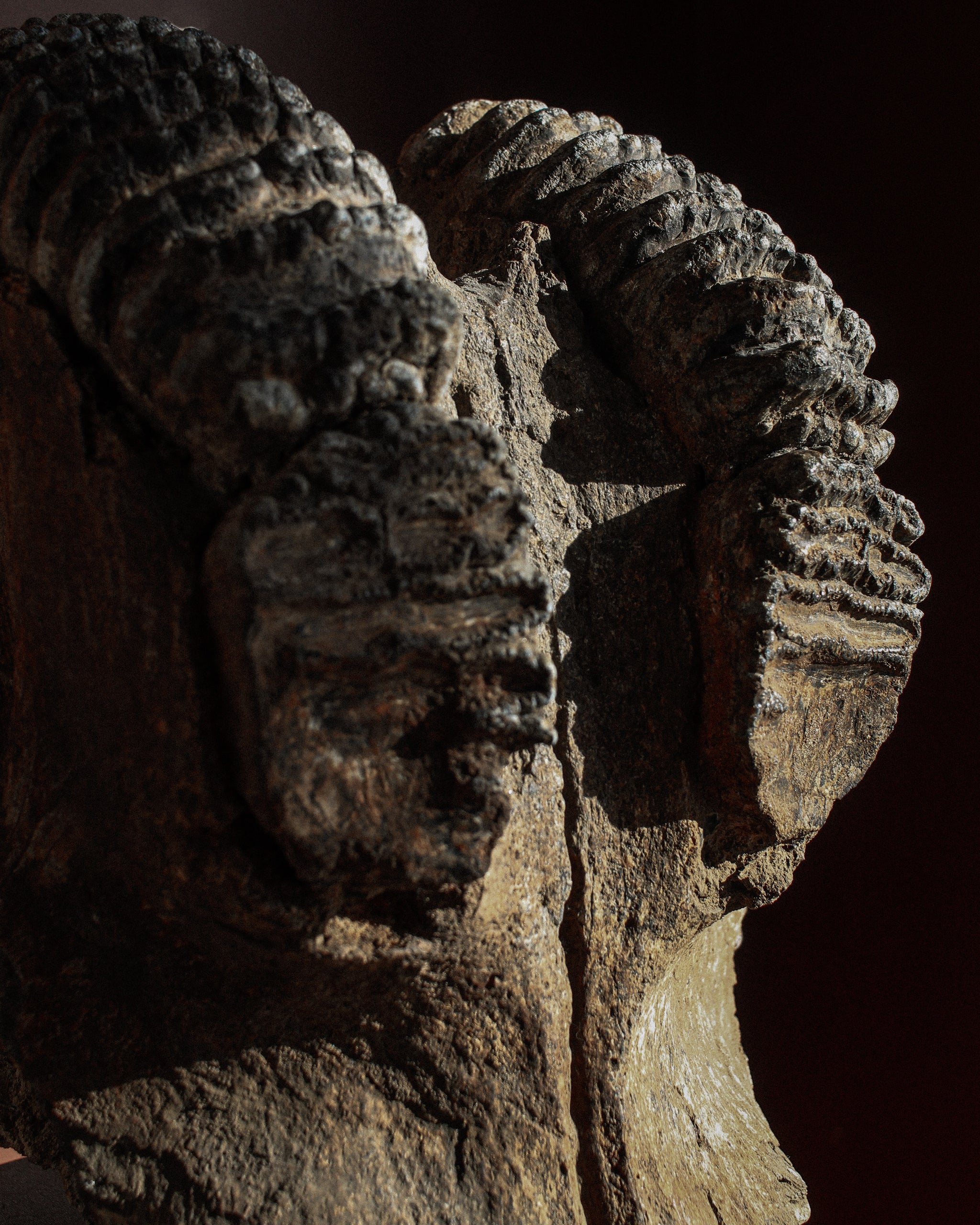 Absolutely bafflingly beautiful and evocative skull and two-molar fragment of an ancient Stegodon, an ancient member of the Elephantidae family, ancestor of mammoths and modern day elephants primarily found in Southeast Asia, when the area was still a continental landmass as opposed to a grouping of archipelagos. This exceedingly rare example shows both sets of upper molars, almost tire like in form, and a large portion of the attached skull. An incredibly rare and beautifully sculptural specimen of large and imposing scale.