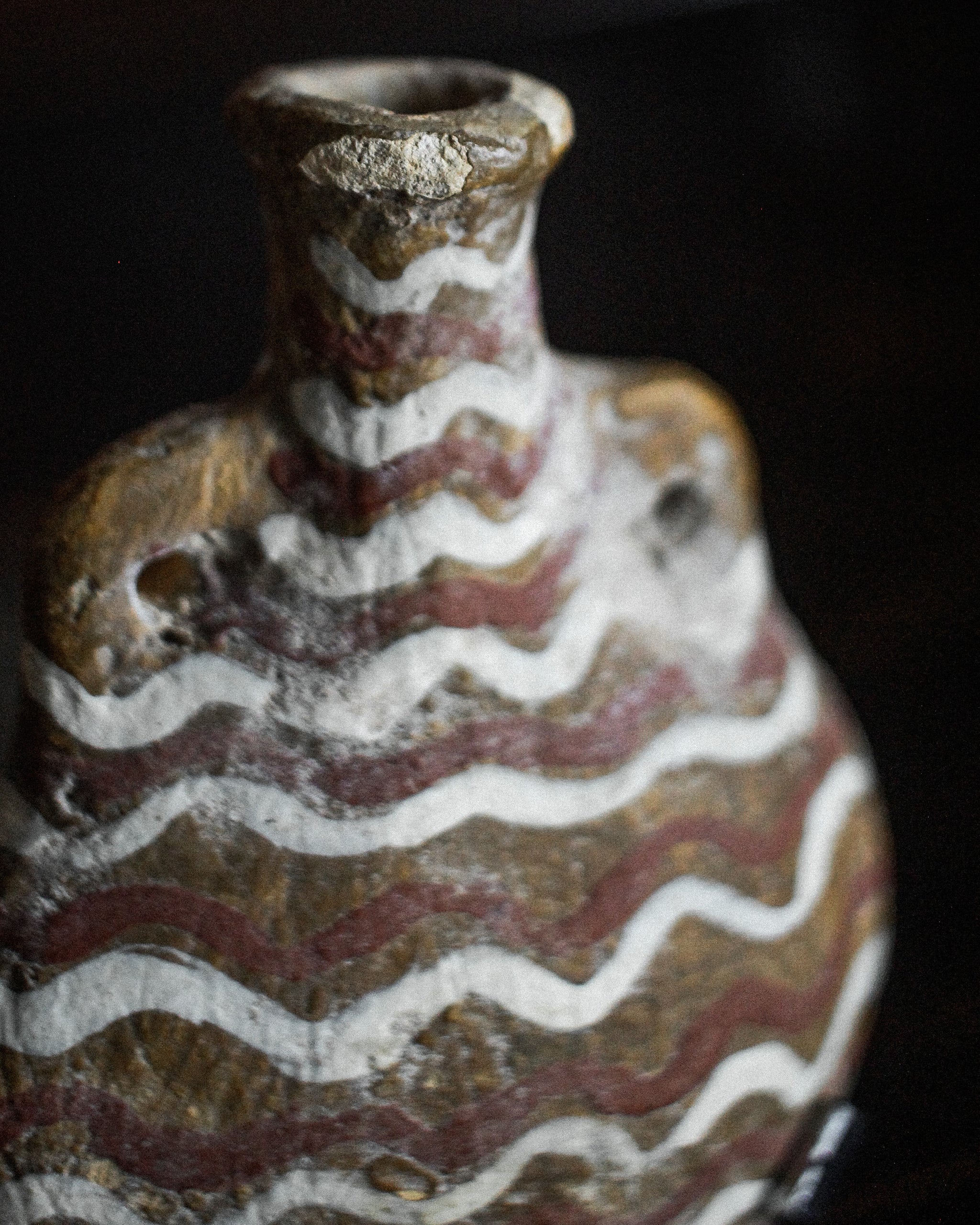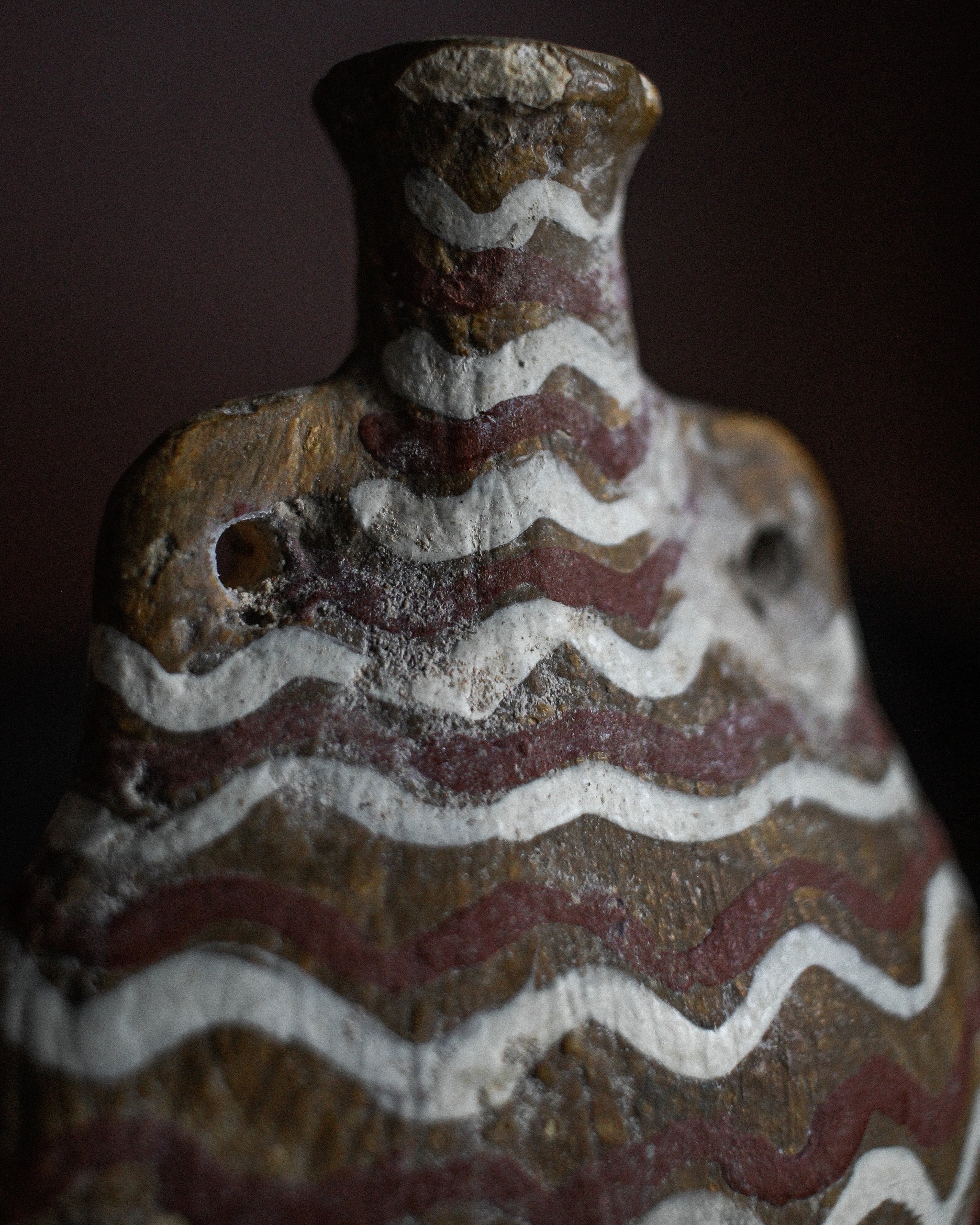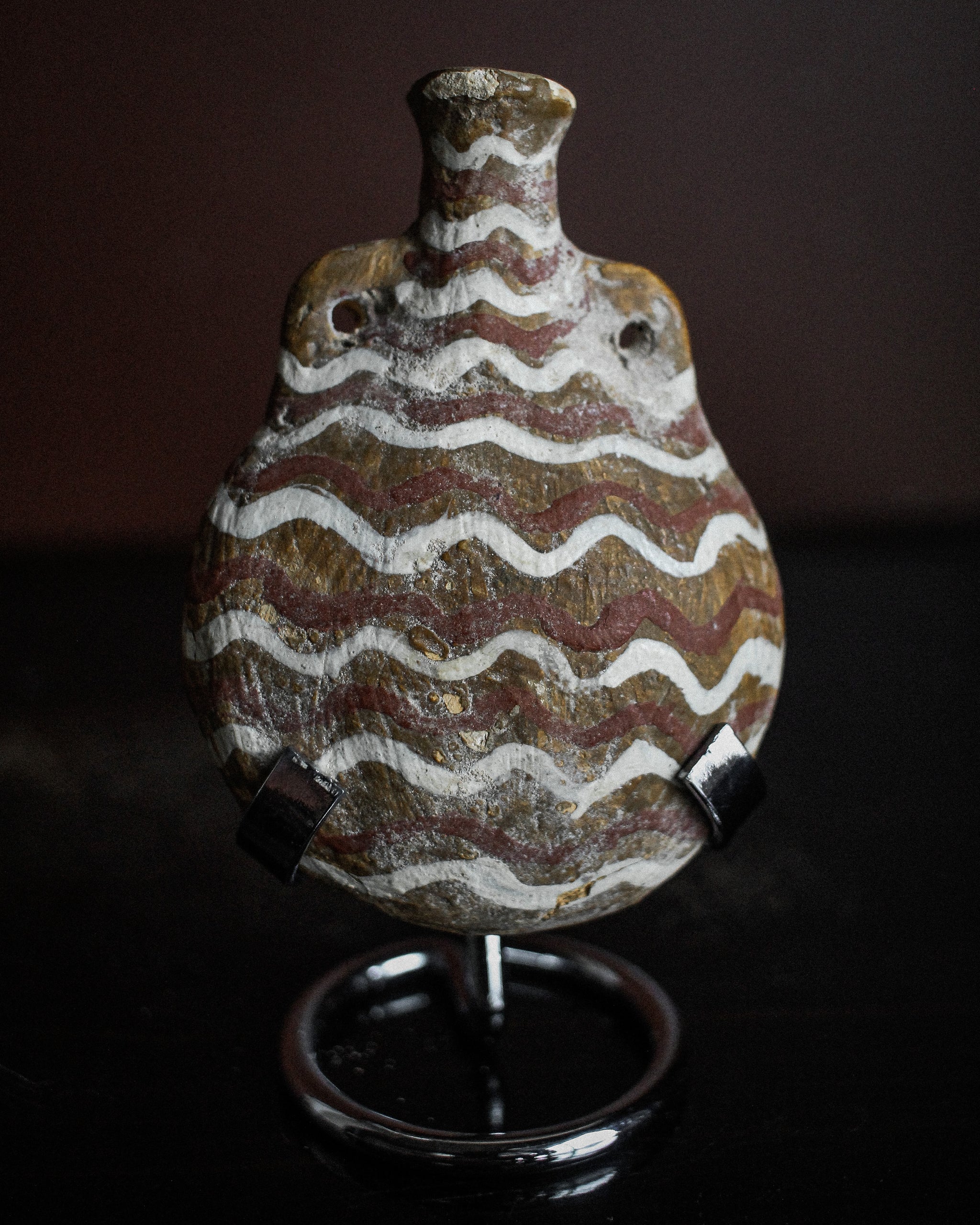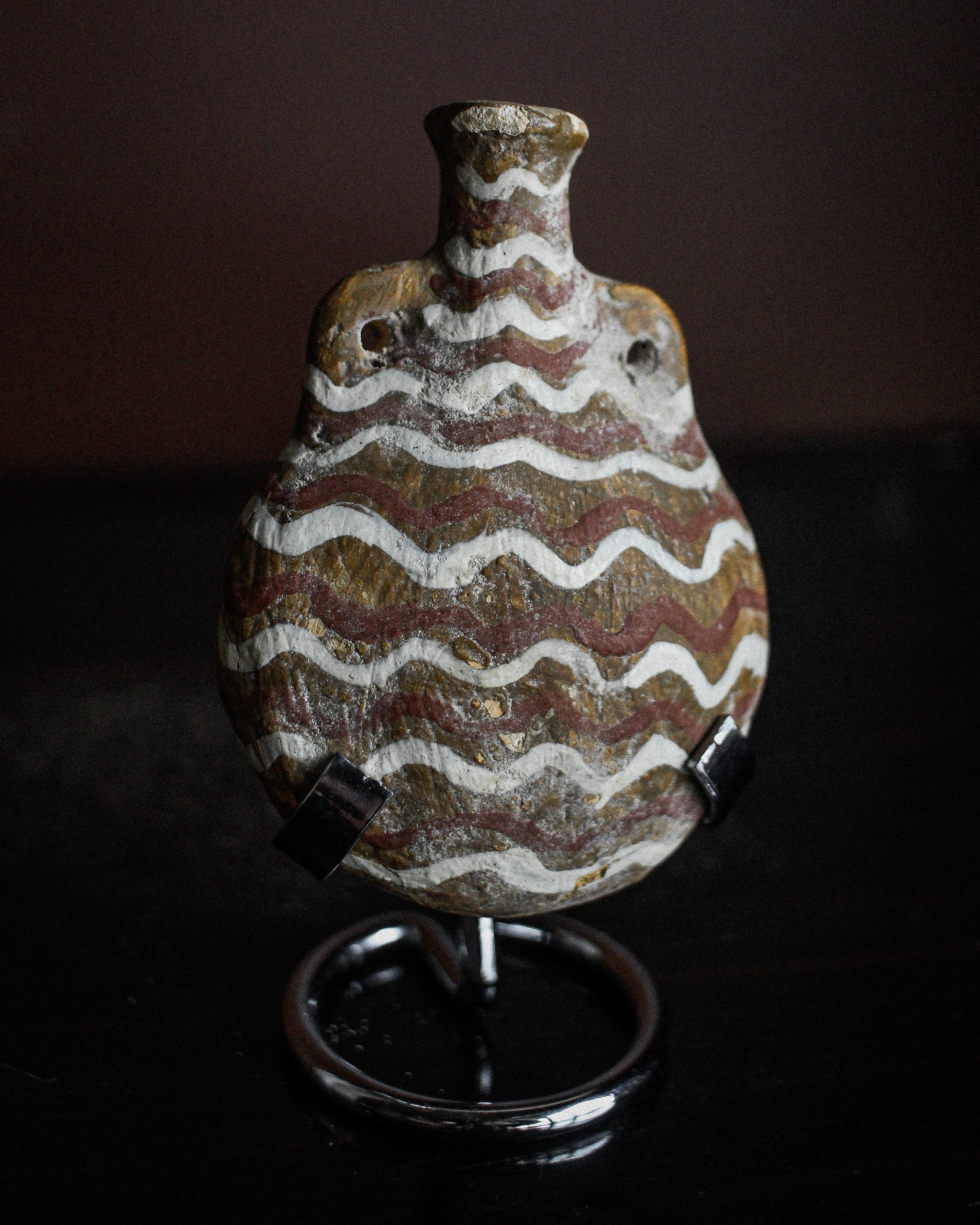 Beautiful miniature pilgrim flask, used for travel with a small amount of holy water. Painted with zig zag motif, dating to the 14th century from Italy.