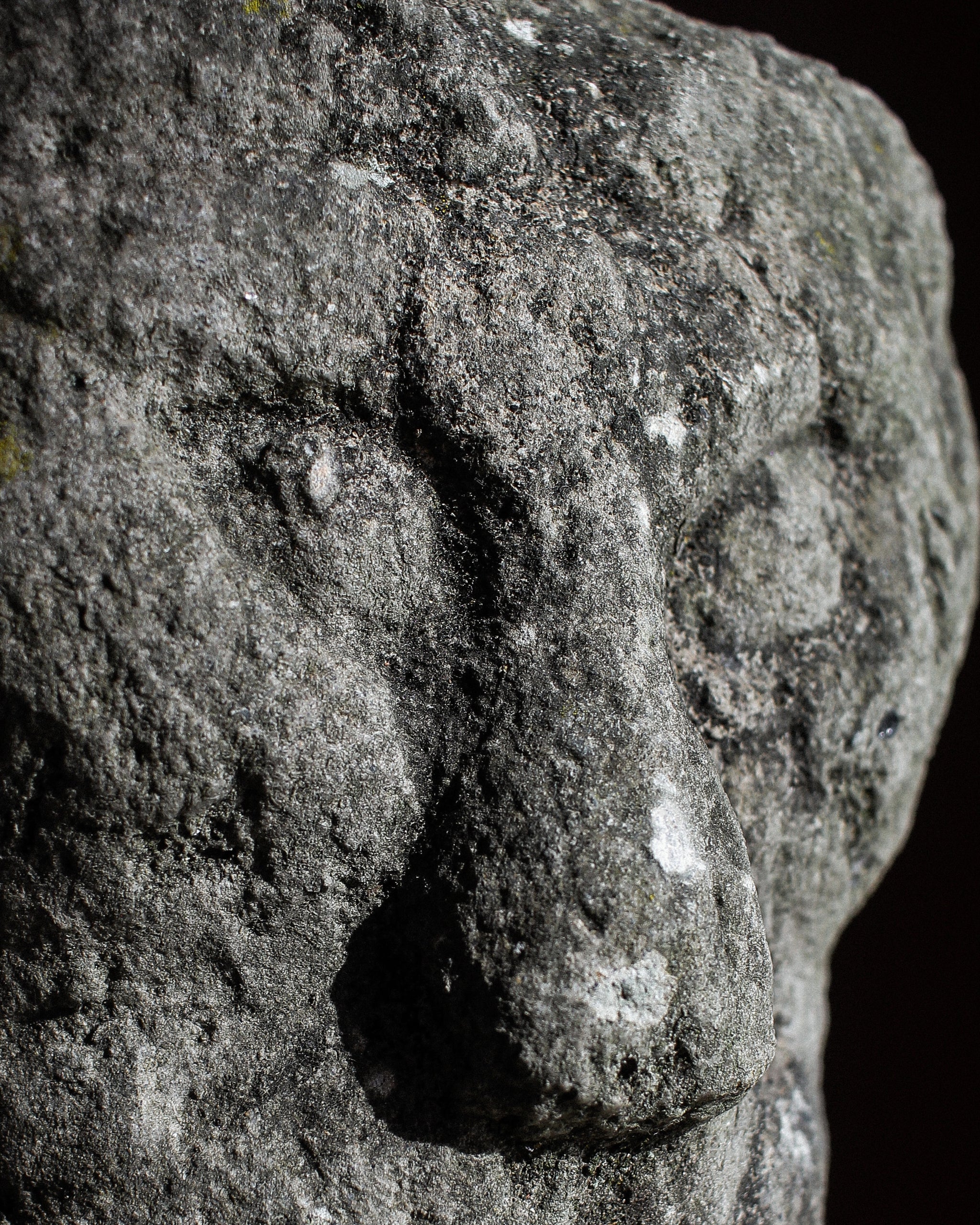 Intensely beautiful 12th century stone sculpture of a head of a lion-man hybrid, exhibiting beautiful features synonymous with the late Romanesque and early medieval period in Tuscany, Italy. An incredible example showing both expert carving while remaining naive and crude. The stone has gained a beautiful natural patina over the nearly thousand years of its life, likely originally built as a finial for a church or estate. Its detailed eyes exhibit haunting gaze while the nose and mouth are much more crude in execution.