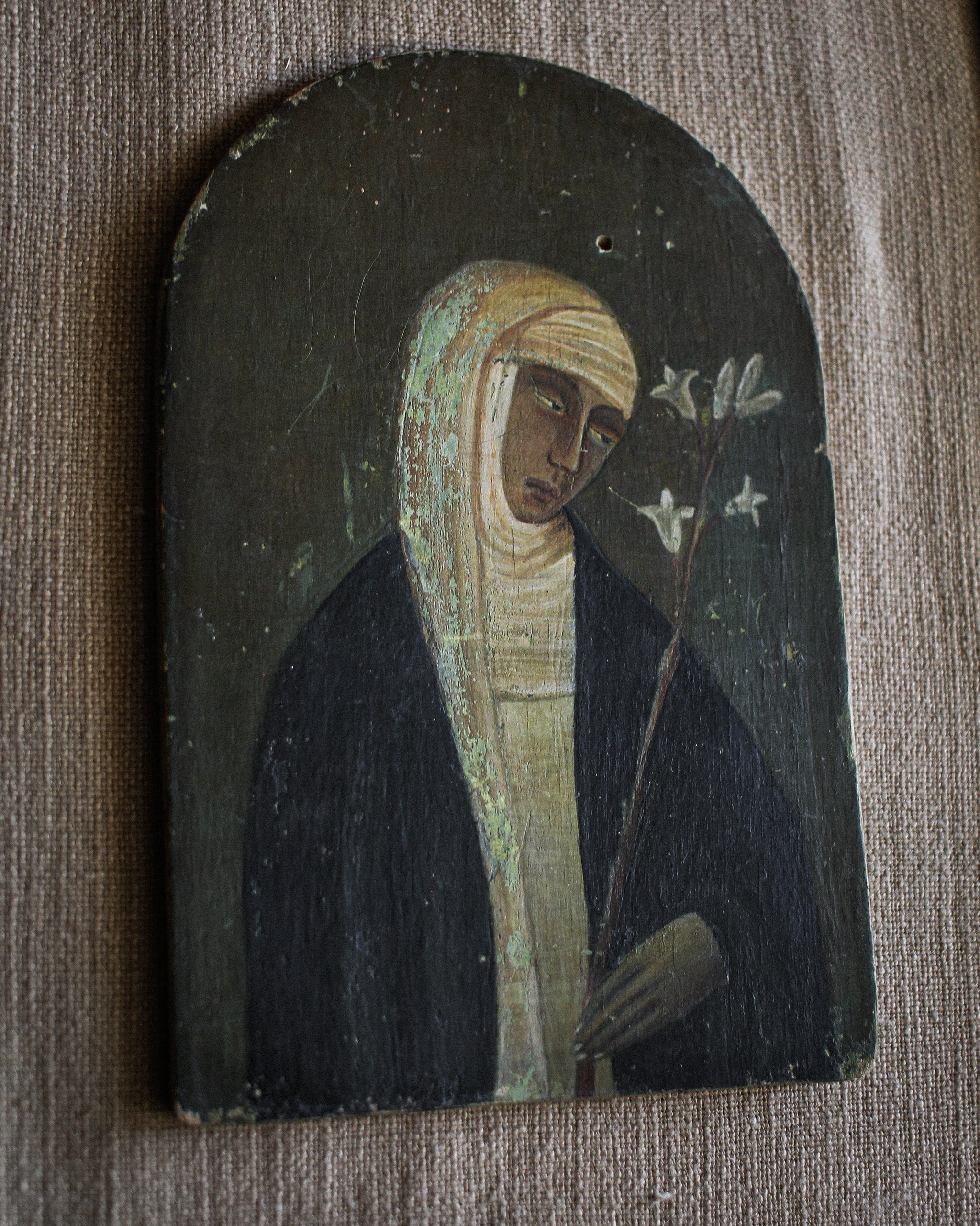 Beautiful tempera on panel devotional painting of Saint Catherine of Siena, done by a follower of the master Andrea Vanni (1332 - 1414), an integral figure in early renaissance painting. Done in the late 17th - early 18th century by a clearly experienced painter, this small panel exudes the emotion and softness in Vanni’s work. Cloaked in a white habit, and holding white lilies, symbolic of purity and spiritual virtue, against a backdrop of simple dark green. A beautiful example of the style and intent of Trecento, early italian devotional renaissance artwork.